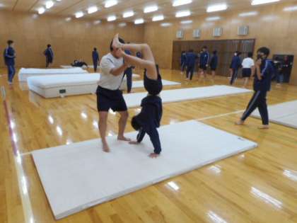 体育では、マット運動に取り組みました。倒立を練習する場面では、互いに支え合ってケガの防止を考えながら活動しました。