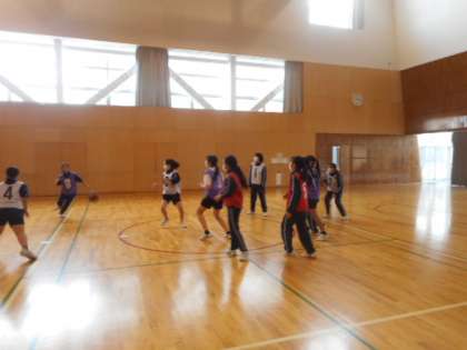 バスケットボールでは、チームで課題を話し合ってから試合形式の練習に臨みました。