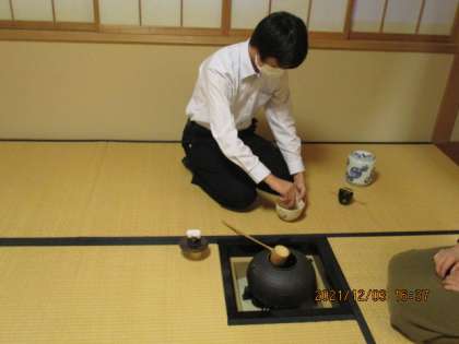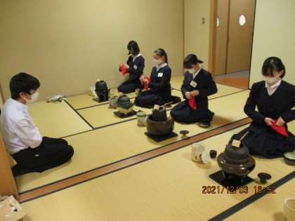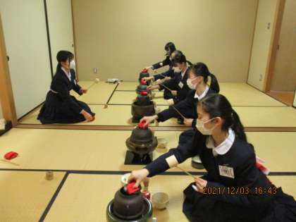 本日の部活動(茶道部) 公開日 2021/12/03 更新日 2021/12/03 芝園の一日 12月3日(金) 先輩の指導のもと、1年生が揃って「風炉」の点前に取り組みました。成長が感じられます。 2年生は、自分の稽古にも、しっかり取り組みました。