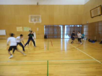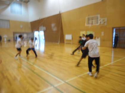 バスケットボール競技に大切なスペースの使い方を考えて3対3の練習をしました。ボールを保持している選手以外がどのように連動するかを考えて取り組みました。