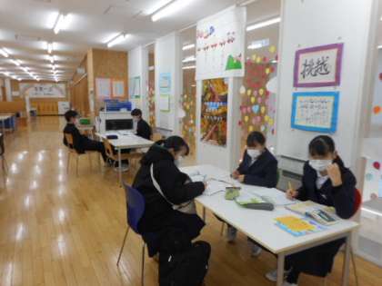SKIP学習 公開日 2021/12/08 更新日 2021/12/08 芝園の一日 12月8日(水) 朝のSKIP学習の様子です。 教室以外の多目的スペースを活用して、進んで学習に取り組んでいます。 仲間と教え合いながら理解を深めていました。