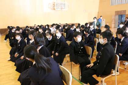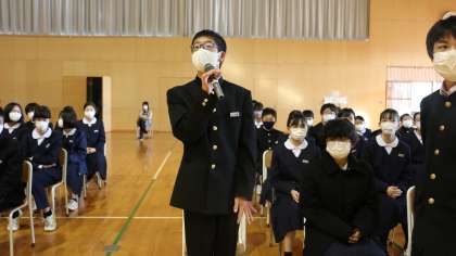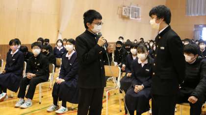 笑顔の輪集会(その2) 公開日 2021/12/10 更新日 2021/12/10 芝園の一日 12月10日(金) 本日行った「笑顔の輪集会」の様子です。 生徒会執行部が主体となり、人権について深く考え話し合うために、12月6日から一週間、「笑顔の輪週間」を行いました。 本日の集会では、執行部による劇や、他県で実際に起こった事例を紹介しながら、人権尊重の重要性と、人権を守るために大切な行動について、生徒全員で考えました。