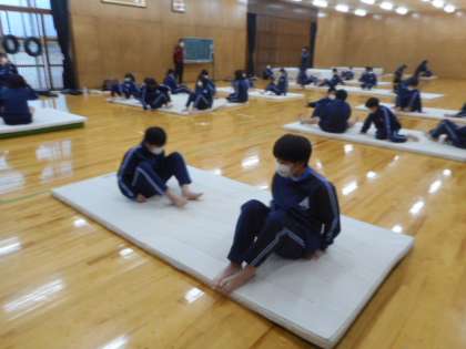 体育では、マット運動に取り組みました。基本的な体の使い方について反復練習しました。