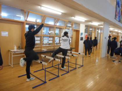 陸上競技部は、天候が悪いため、屋内練習となりました。ハードルを使った体幹を鍛えるトレーニングをしました。