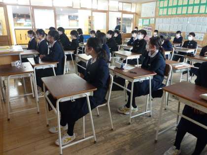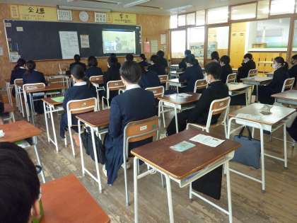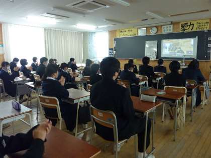 1年生は、Meetを利用して、教室で終業式に参加しました。教室にいながらもスクリーンにしっかり顔を向け、生徒の意見発表や校長先生のお話を真剣な面持ちで聴いていました。