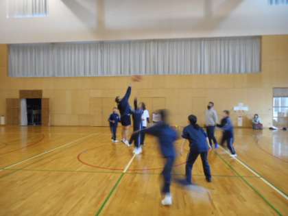 4対4でゲーム形式の練習をしました。5対5と違って、広いスペースを利用して攻めることを考えて取り組みました。コーチにも参加してもらい、活気のある練習となりました。