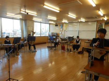 今日の部活動(その2) 公開日 2022/01/08 更新日 2022/01/08 芝園の一日 1月8日(土) 吹奏楽部の様子です。 10日(月)に行われるアンサンブルコンテストの本番に向けて、真剣に練習に励んでいました。