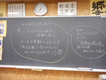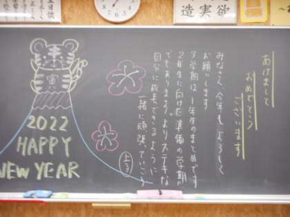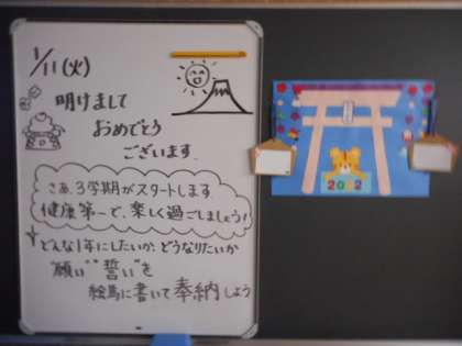 新学期スタート(その5) 公開日 2022/01/11 更新日 2022/01/11 芝園の一日 1月11日(火) いよいよ3学期が始まります。 各教室の黒板には、新しい学期を迎えるにあたって、担任から温かいメッセージが書かれており、登校した生徒を迎えました。