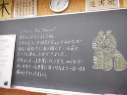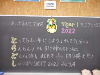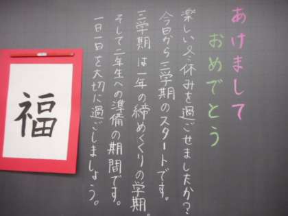 新学期スタート(その6) 公開日 2022/01/11 更新日 2022/01/11 芝園の一日 1月11日(火) いよいよ3学期が始まりました。 各教室の黒板には、新しい学期を迎えるにあたって、担任から温かいメッセージが書かれており、登校した生徒を迎えました。