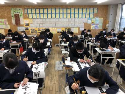 書き初め大会(1年生:その4) 公開日 2022/01/11 更新日 2022/01/11 芝園の一日 1月11日(火) 書き初め大会の様子です。 真剣な態度で集中して書に向かいあっていました。 写真:C組