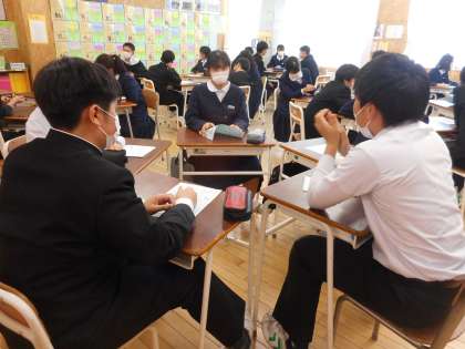 2学年 総合的な学習の時間(その2) 公開日 2022/01/12 更新日 2022/01/12 芝園の一日 1月12日(水) 2学期後半から、進路学習を始めています。 冬休み中、高校生に聞いたことや、高校について調べたことを伝え合いました。