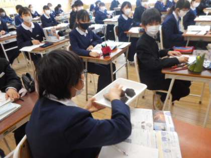 理科では、火山について学習しました。火山岩を実際に触ってみました。