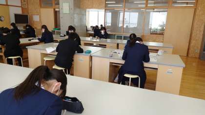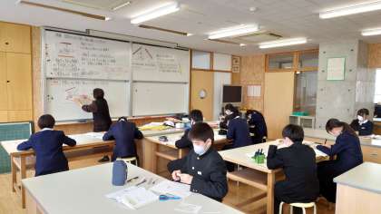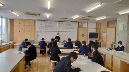 本日の授業(1年生:その4) 公開日 2022/02/17 更新日 2022/02/17 芝園の一日 2月17日(木) 1年生の数学の様子です。 少人数で授業をしています。 「空間内における直線と平面の垂直」について学習しました。