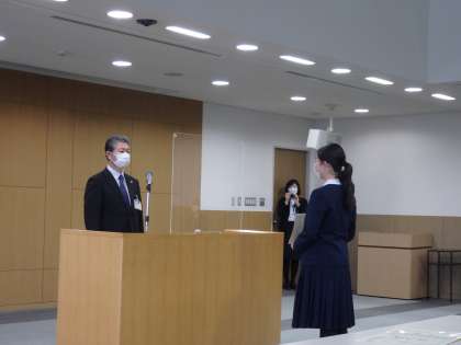 富山市全国大会等上位入賞報告会 公開日 2022/02/21 更新日 2022/02/22 芝園の一日 2月21日(月) 18日に行われた富山市全国大会等上位入賞報告会の様子です。 本校の第一回ワールドカップ型選抜全国空手道選手権大会 中1・中2女子の部で優勝しました齋藤さんが、宮口教育長からお祝いの言葉をいただきました。