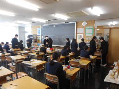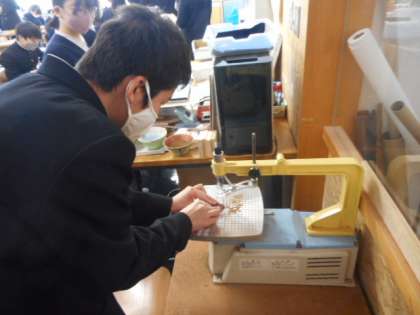 本日の授業(3年生) 公開日 2022/02/21 更新日 2022/02/21 芝園の一日 2月21日(月) 3年生の授業の様子です。 美術では、堆朱(ついしゅ)の工芸制作に取り組みました。電動ノコギリで形を整えました。