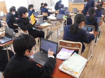 家庭科では、自宅で調理した内容をクロームブックを活用してまとめ、調理実習を通して学んだことを発表しました。