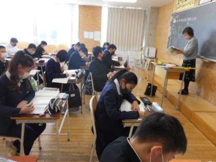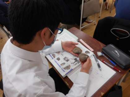 昨日の授業(1年生:その1) 公開日 2022/03/08 更新日 2022/03/08 芝園の一日 3月8日(火) 1年生の授業の様子です。 数学では、確率について学習しました。理科では、地層について学習しました。アンモナイトの化石に実際に触れてみました。