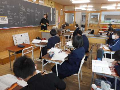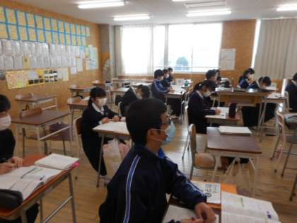 本日の授業(1年生:その2) 公開日 2022/03/08 更新日 2022/03/08 芝園の一日 3月8日(火) 1年生の授業の様子です。 数学では、球の体積や表面積の求め方について公式を確認し、演習問題に取り組みました。