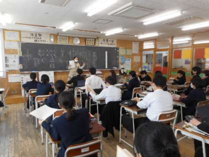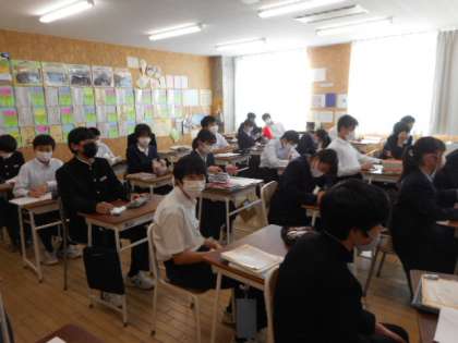本日の授業(2年生:その3) 公開日 2022/03/09 更新日 2022/03/09 芝園の一日 3月9日(水) 2年生の授業の様子です。 国語では、昨日行われた県立高校一般入試の問題に挑戦しました。