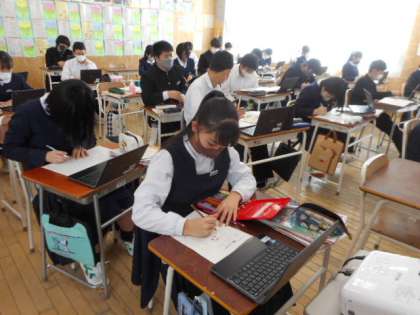 本日の授業(2年生:その4) 公開日 2022/03/09 更新日 2022/03/09 芝園の一日 3月9日(水) 2年生の授業の様子です。 英語では、「芝園中学校のインフルエンサーになろう」という課題に取り組みました。おすすめのお店についてクロームブックで調べ、英作文を作りました。