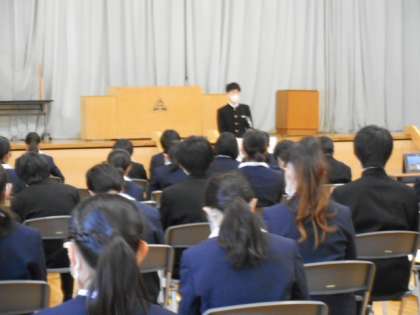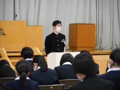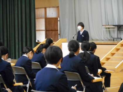 先輩の3年間の学校生活の経験から生まれた実感のこもったアドバイスや励ましの言葉に、1年生の生徒達は、メモを取りながら、話し手の先輩に真剣な眼差しを向けて、話を聴いていました。