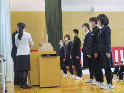 3月14日(月) 皆勤賞授与の様子です。 3年間皆出席、無遅刻の生徒に、皆勤賞を授与しました。