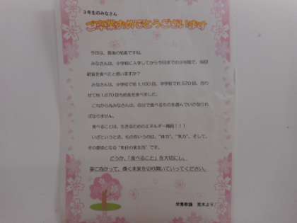 「みなさんは、小学校に入学してから9年間で何回給食を食べたと思いますか?小学校で約1,100回、中学校で約570回。合わせて1,670回も給食を食べました。食べることは、生きるためのエネルギーの補給!!!どうか『食べること』を大切にし、夢に向かって、輝く未来を切り拓いていってください。」