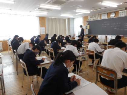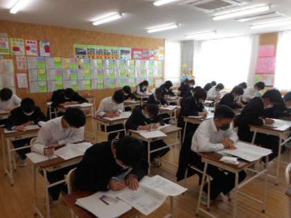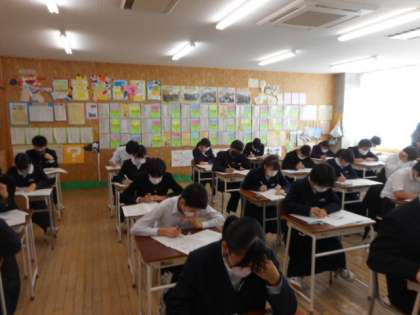 本日の授業(2年生:その3) 公開日 2022/03/16 更新日 2022/03/16 芝園の一日 3月16日(水) 2年生の確認テストに様子です。 毎日家庭で取り組んでいるテキスト学習の成果を確認するテストです。 生徒は、真剣に取り組んでいました。