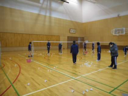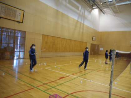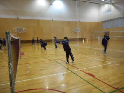 バドミントン部は、基礎打ちを入念に行いました。あいにくの天候で体育館は冷えきっていましたが、元気に声をかけ合って取り組みました。