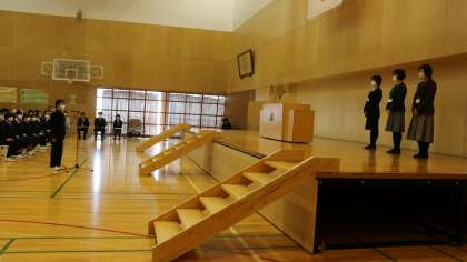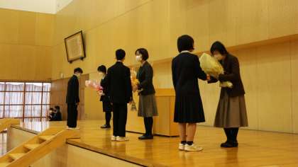 代表生徒から感謝のメッセージを述べた後、花束を渡しました。