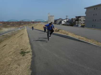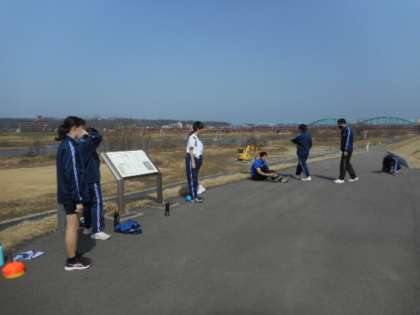 種目に分かれて練習をしました。跳躍ブロックは、走り高跳びの踏切を意識して取り組みました。短距離ブロックは、河川敷の坂道を駆け上がりました。