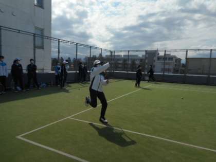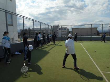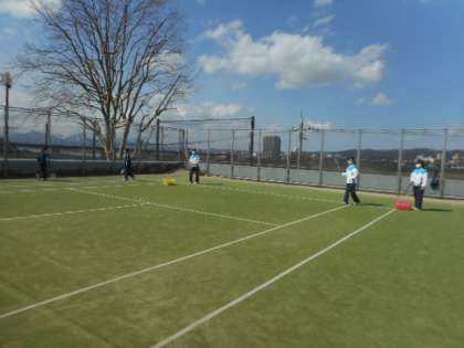 女子ソフトテニス部の様子です。サーブ・レシーブの練習を中心に取り組みました。爽やかな挨拶と活気あるかけ声がコートに響いていました。