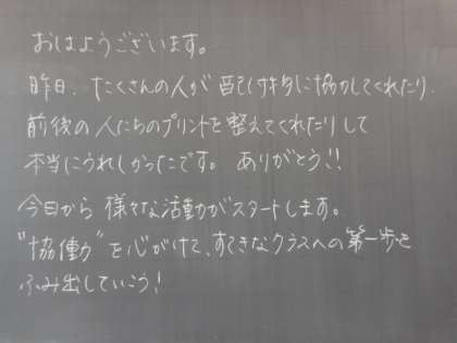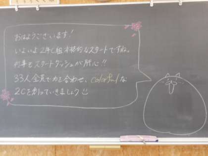 朝の風景から(2年生) 公開日 2022/04/07 更新日 2022/04/07 芝園の一日 4月7日(木) 黒板には、担任の先生から温かいメッセージが書かれていました。新年度2日目を温かい気持ちで迎えられそうですね。