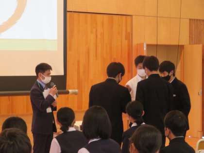 学年担当から、この1年間への願いや目標について話を聞きました。最後に5月の体育大会に向けて、団を決定しました。