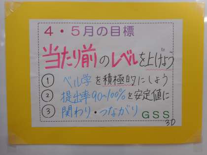 3学年 月目標 公開日 2022/04/15 更新日 2022/04/15 芝園の一日 4・5月の目標を決め、「こんな3年生になる」という決意も掲示しました。 最虹の一年になるように、日々皆で努力していきたいですね。