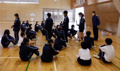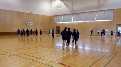 まずは、バトン練習から。グループで、声をかけ合ってバトンの受け渡しを練習しています。