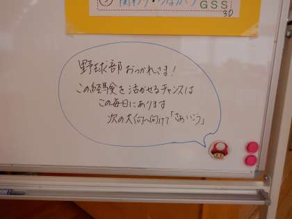 応援メッセージ 公開日 2022/04/18 更新日 2022/04/18 芝園の一日 4月18日(月) 7:50 朝、3年生廊下のホワイトボードを見ると、16日に大会があった野球部への応援メッセージが書かれていました。 次の大会に向けて「さあいこいう!」 温かく力強いエールです。頑張ろう!野球部!