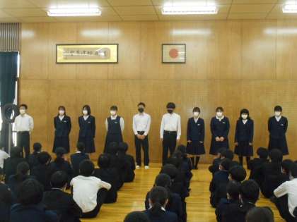 3年生は、昨日(20日)学年集会を開いて、体育大会実行委員、係長、団長・団リーダー、パネル係の紹介をしました。