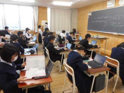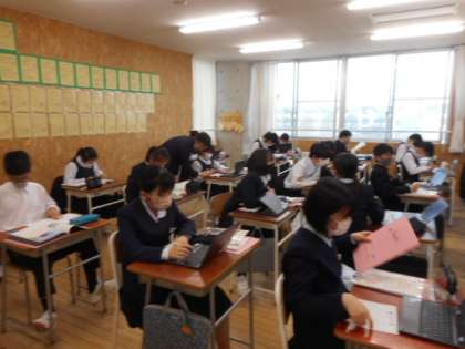 2−Bの英語の授業風景です。2年生の英語の時間は、ALTの先生や教科担当の教師の説明がほとんど英語で行われています。生徒も新しく学習したことを声に出して表現していました。