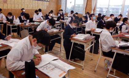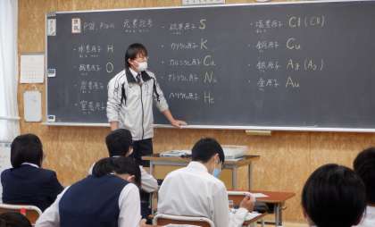 2年生の理科では「元素記号」について学習をしています。元素記号についている数字の意味や覚え方など、先生の説明を真剣に聞いています。