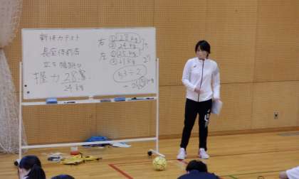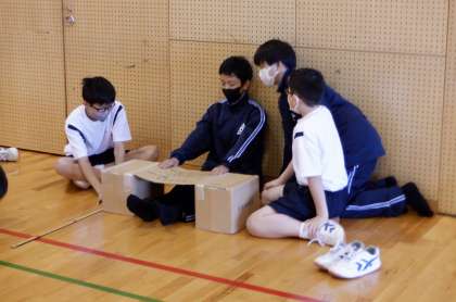 新体力テストをしています。先生の説明を聞いた後、男子は「長座体前屈」の測定をしています。