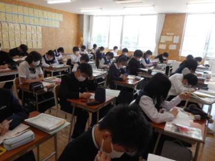 演習問題に挑戦 2−C理科 公開日 2022/05/06 更新日 2022/05/06 芝園の一日 5月6日(金) 3限 2−Cの理科の授業風景です。 今日は、単元のまとめの演習問題に取り組みました。どの生徒も真剣に取り組んでいました。