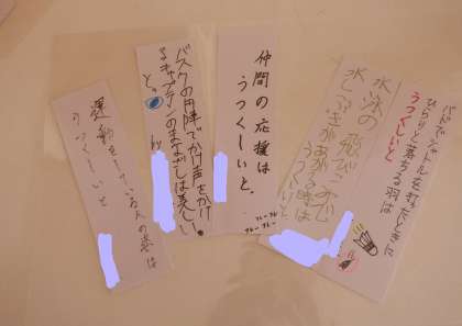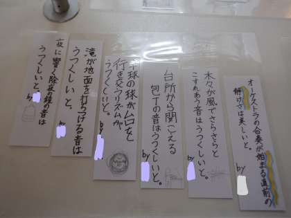 世界はうつくしいと 3年国語 公開日 2022/05/06 更新日 2022/05/06 芝園の一日 5月6日(金) 3年生のワークスペースには、4月に国語の授業で学習した「世界はうつくしいと」に関する掲示物が展示してあります。 一人一人が「うつくしい」と感じるもの(こと)を短冊に記しています。 ・木々が風でさらさらとこすれる音 ・台所から聞こえる包丁の音 ・仲間の応援 は「うつくしいと」。 ステキな感性ですね。