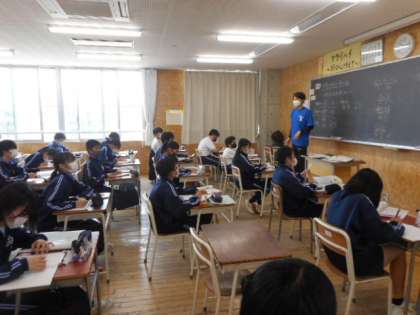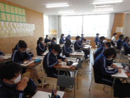 2−Bの理科の授業風景です。化学反応式について学習しました。これまで学習した元素記号がどのように結びついているのか、化学反応式で表して確認しました。