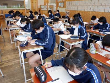 制限時間を決めて、原稿用紙の使い方の決まりを守って、自分の考えを表現しています。難しい課題にも挑んでいる1年生。応援しています!