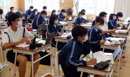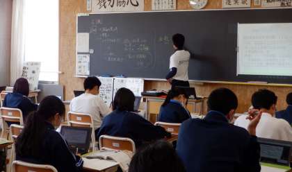 先生の作成した資料や課題がタブレットを通して見ることができます。生徒は上手にタブレットを活用して、理解を深めています。