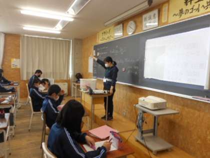 2−Aの英語の授業風景です。英語科では、単語を繰り返し発音して理解を深めています。教師の説明も多くが英語で話されています。英語に親しみながら学習しました。