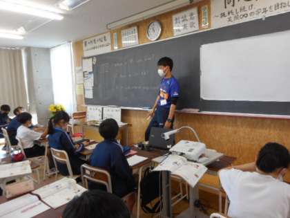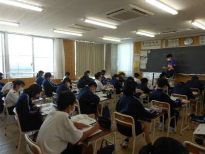 1−Aの英語の授業風景です。1限の体育大会の練習の疲れを見せずに、真剣に学習に取り組んでいました。学習した単語や基本文を積極的に発音して理解を深めていました。