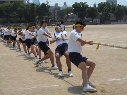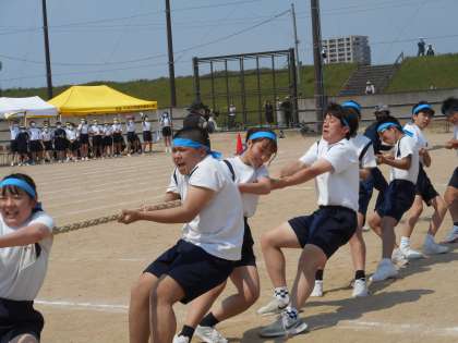 体育大会 その11 公開日 2022/05/19 更新日 2022/05/19 芝園の一日 プログラム8番は、3年生による「君のなわ?ボクの綱!!」です。半数の生徒は、グラウンドを走ってから、綱引きに参加します。