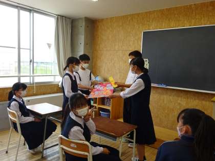 本日、2、3年生の先輩たちから1年生へ体育大会の感謝のメッセージをいただきました。